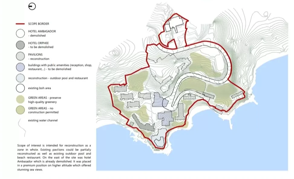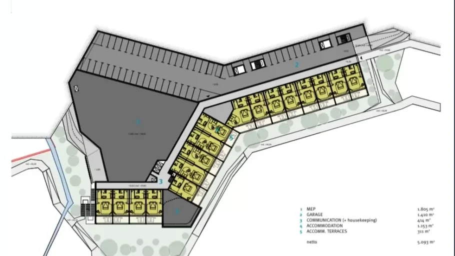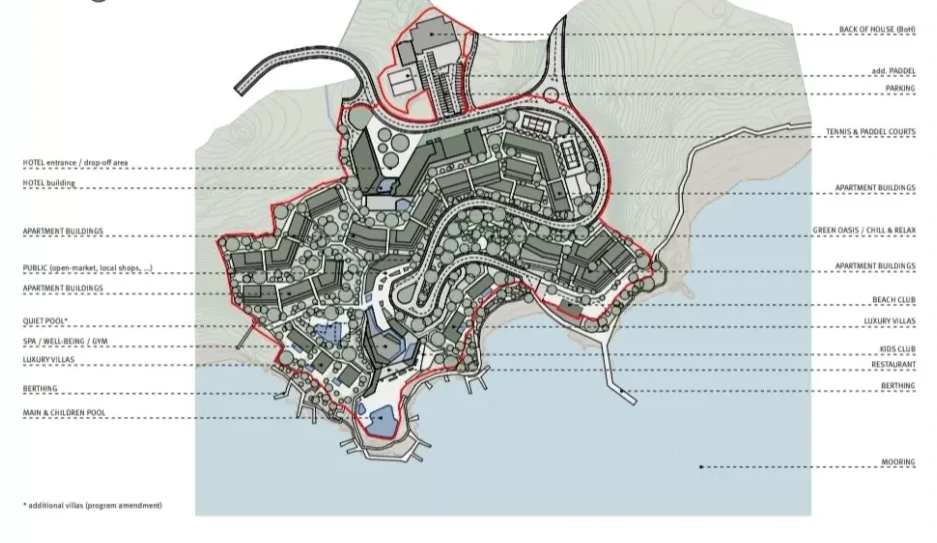 The hotel complex is planned as a large integrated resort (central hotel building, 4 connected buildings, 20 dependances) with accompanying hospitality, wellness, conference, and entertainment facilities, intended for various guest segments (individual, family, business).